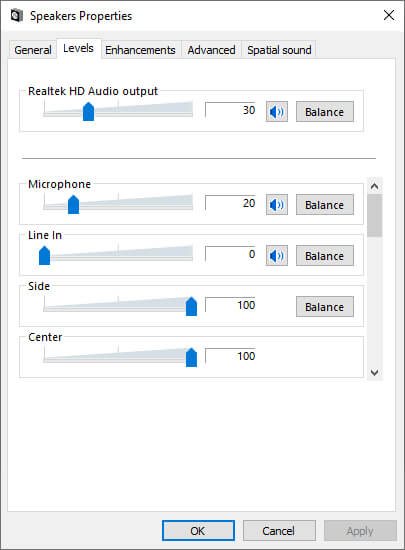 Select ‘Playback Settings’ and move to ‘Properties’, then ‘Levels’. Here, you can adjust the volumes. These controls affect the input sensitivity and output levels.